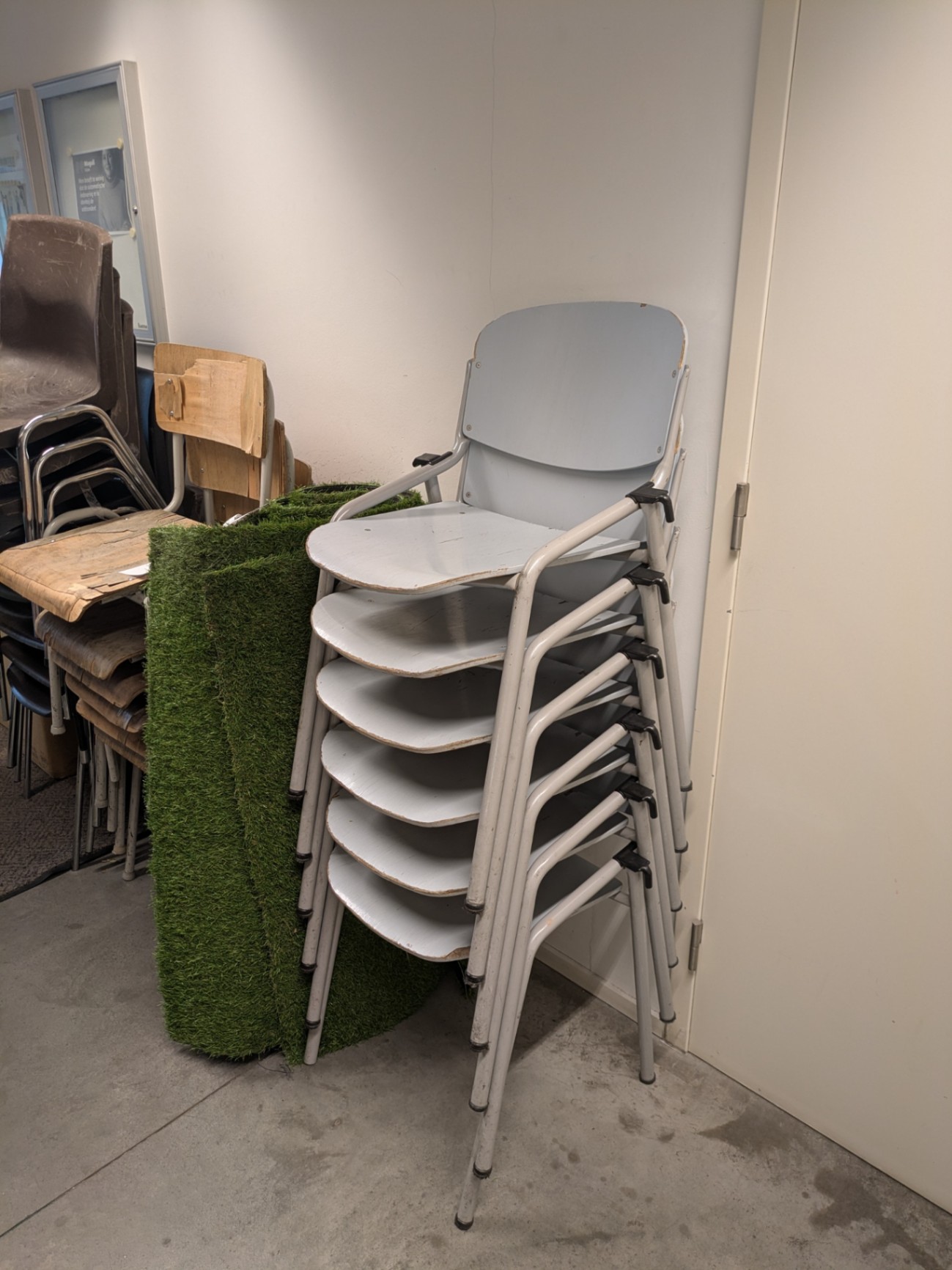 Stoelen zijn gebruikt bij Leesstraat gedurende zomer. Sommigen zijn nog in goede staat, andere hebben oplapwerk nodig of kan het frame gebruikt worden om nieuwe stoelen te maken
