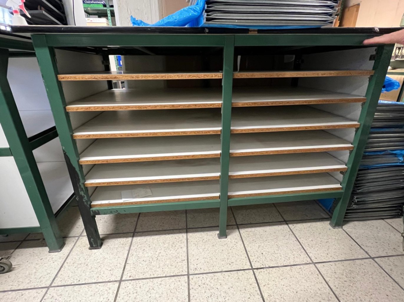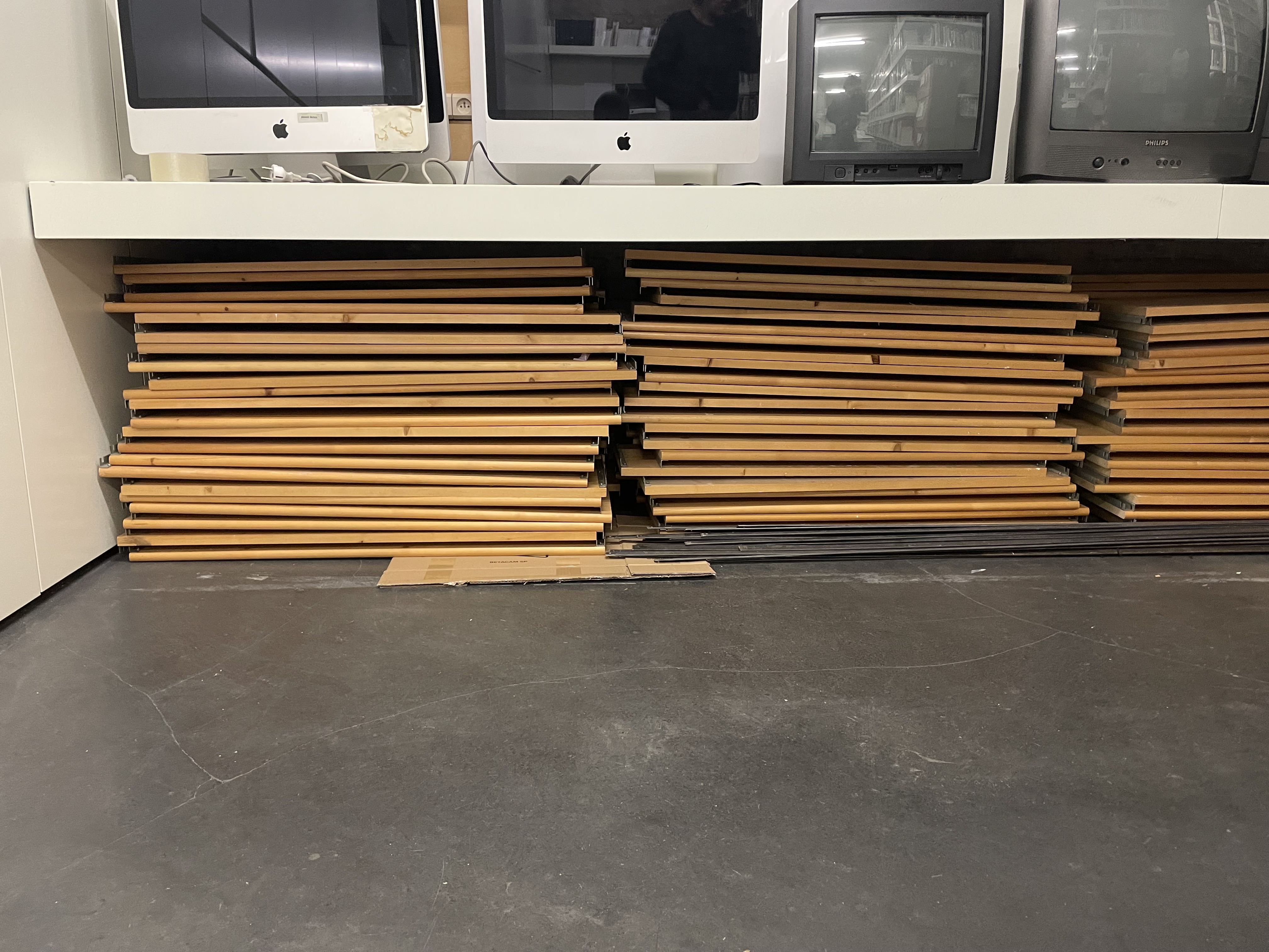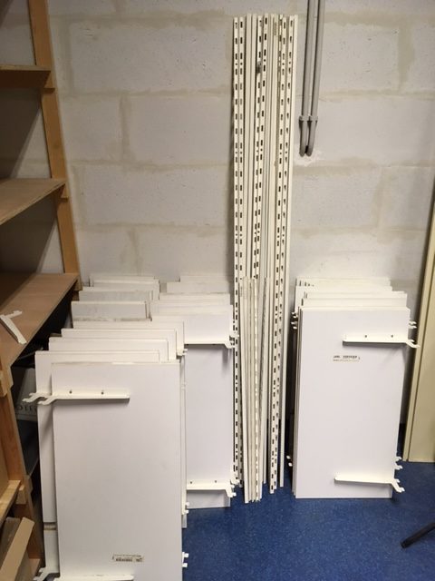 Shelves from different widths size: used to be archive shelves but not all elements are available (screws, etc.) Can be used for wood recuperation etc. Min. 50 pieces to fetch at the same time!