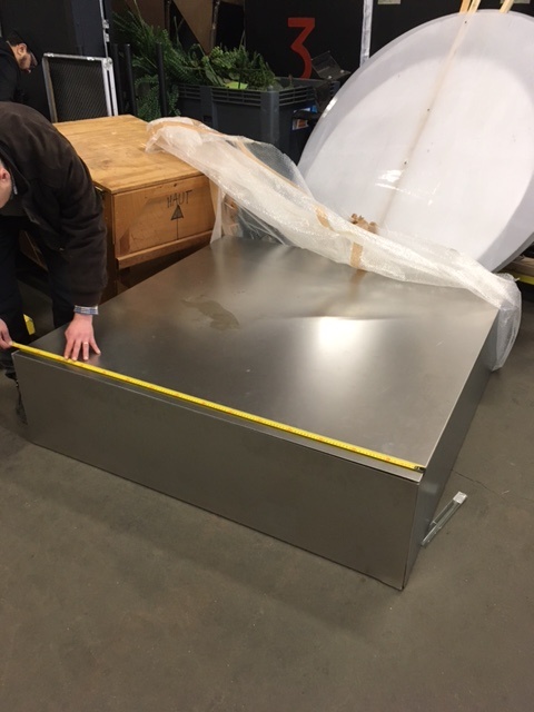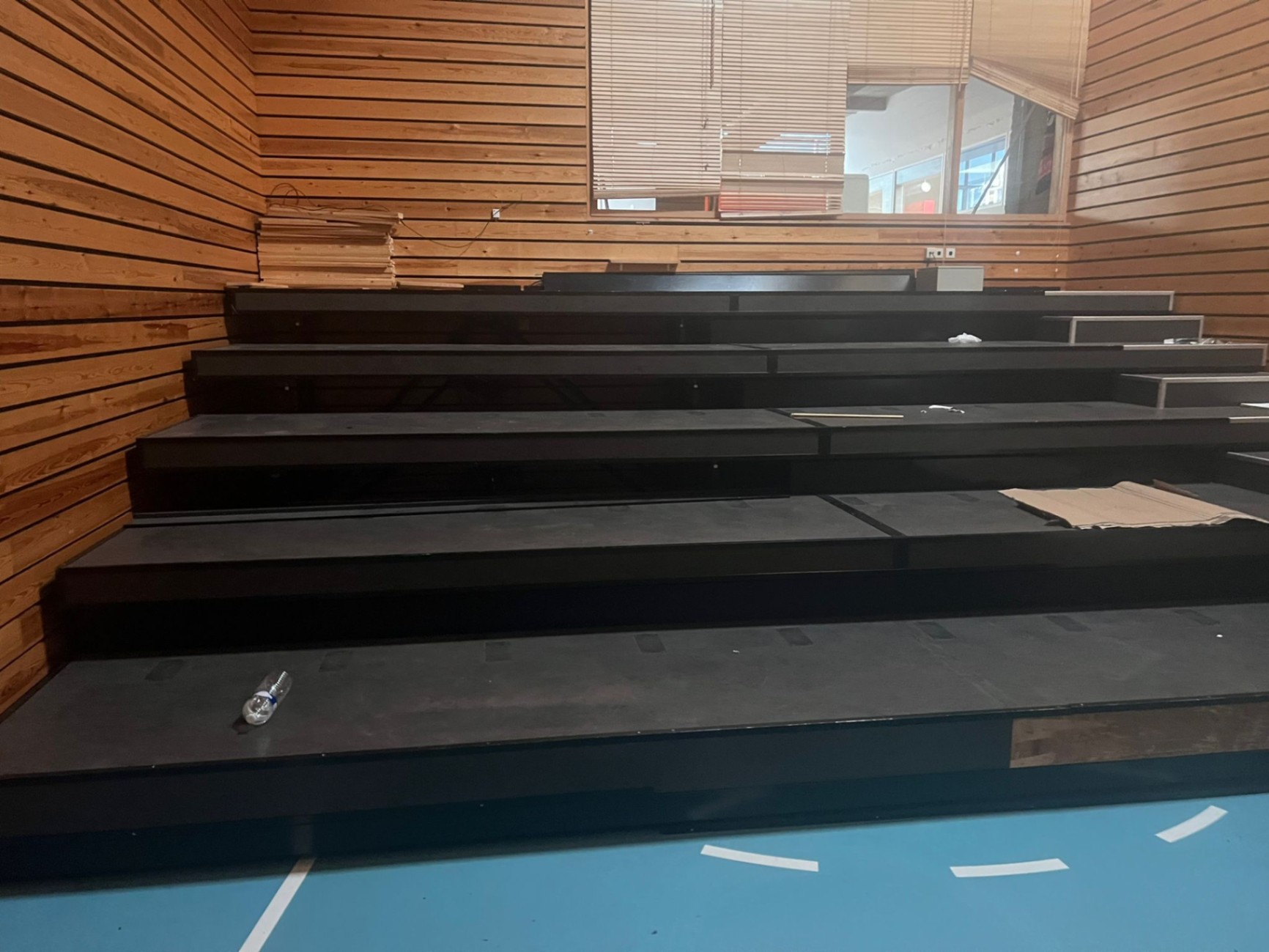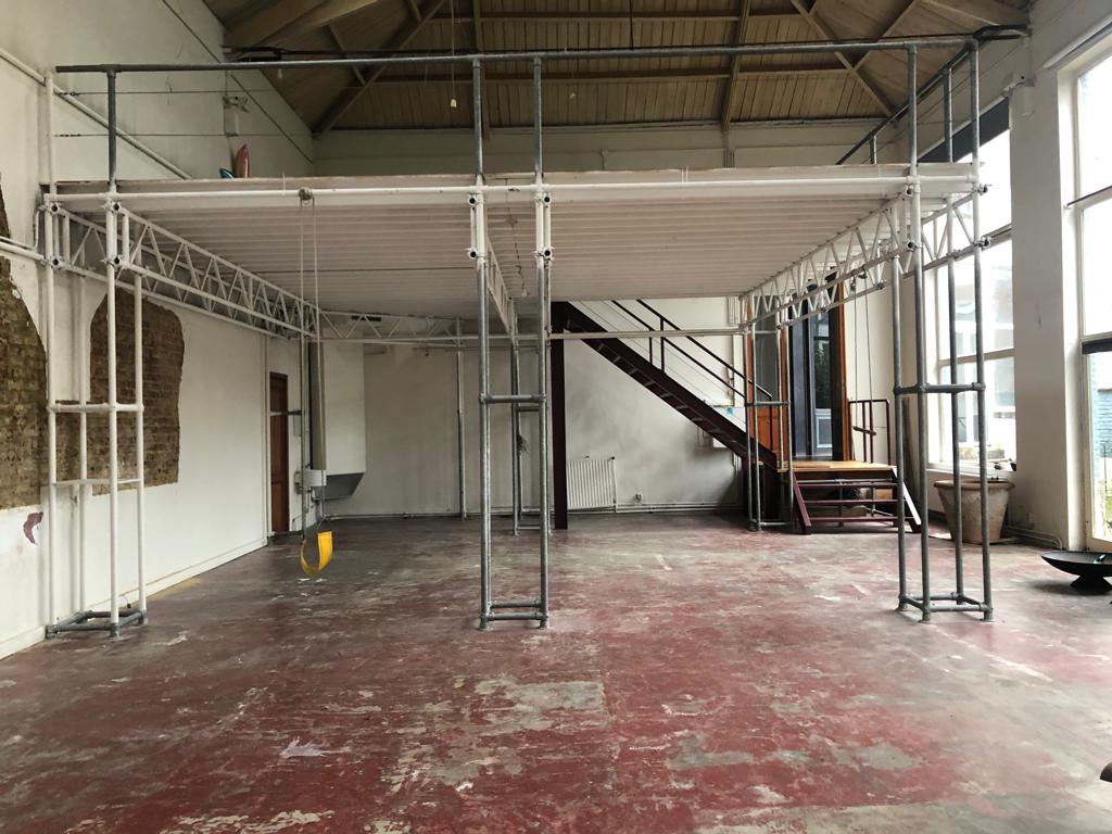 A démonté sur place. Plateforme pro (hauteur 4m) de approx 6m x 6m avec 2 escaliers en métal sur mesure. Ter plaatse te ontmantelen. Professioneel platform (hoogte 4m) van ca. 6m x 6m met 2 op maat gemaakte metalen trappen