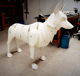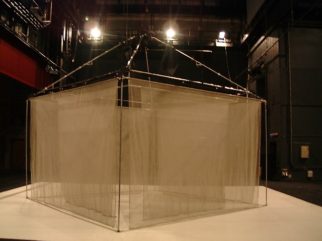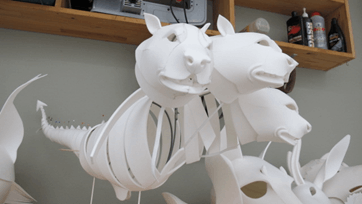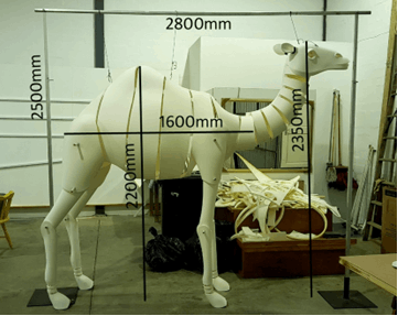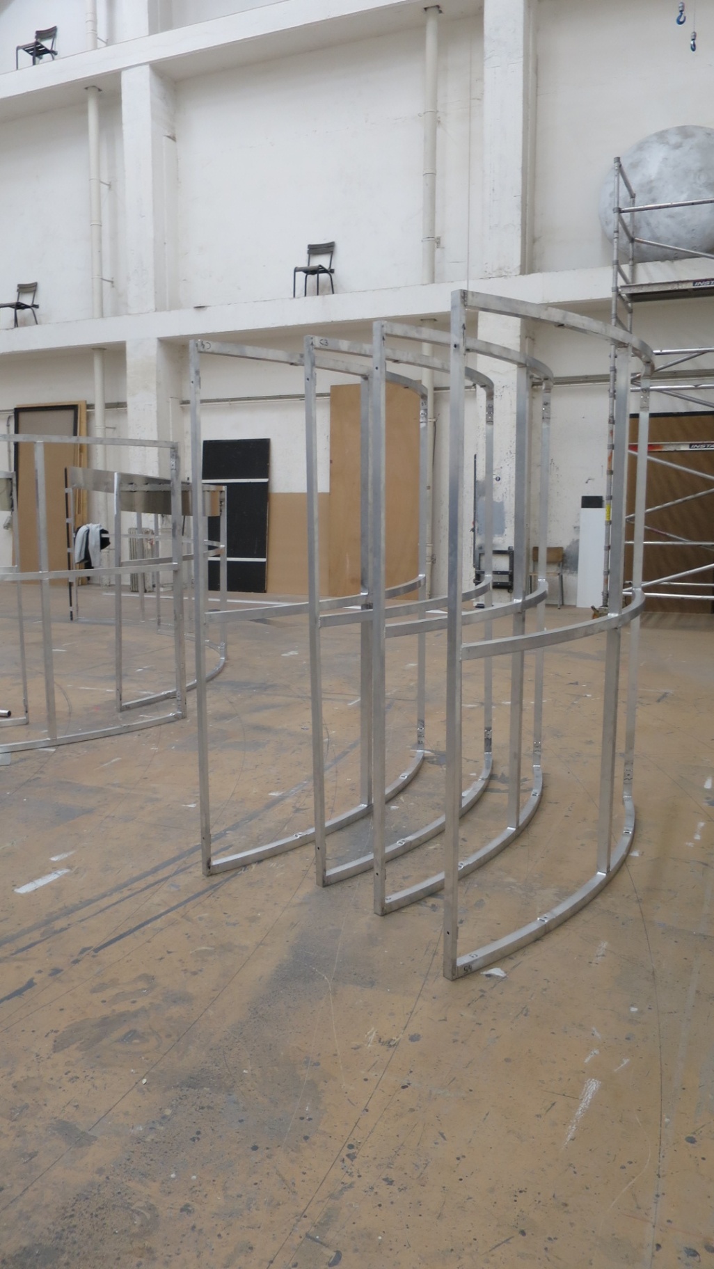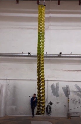 Plooibare gedecoreerde draagstructuur in polycarbonaat die gedragen wordt door 12 mensen. Plaques polycarbonate décorés, pliables et portables par 12 personnes.