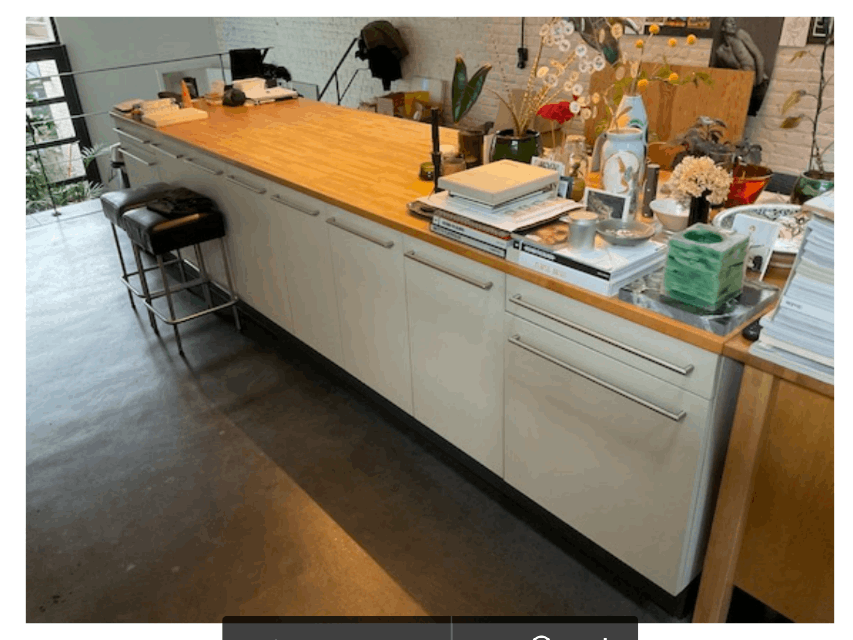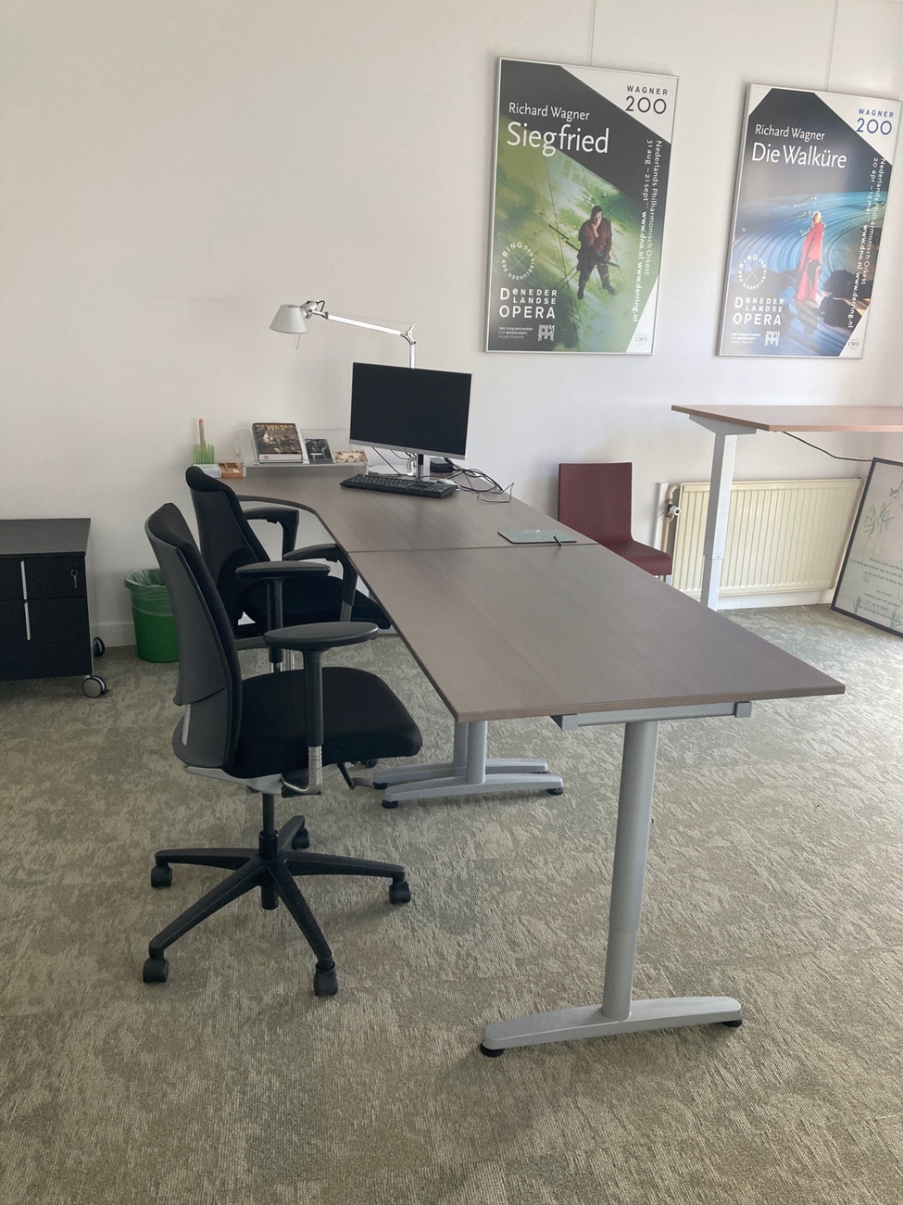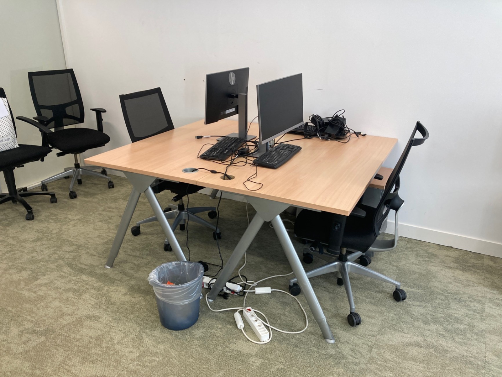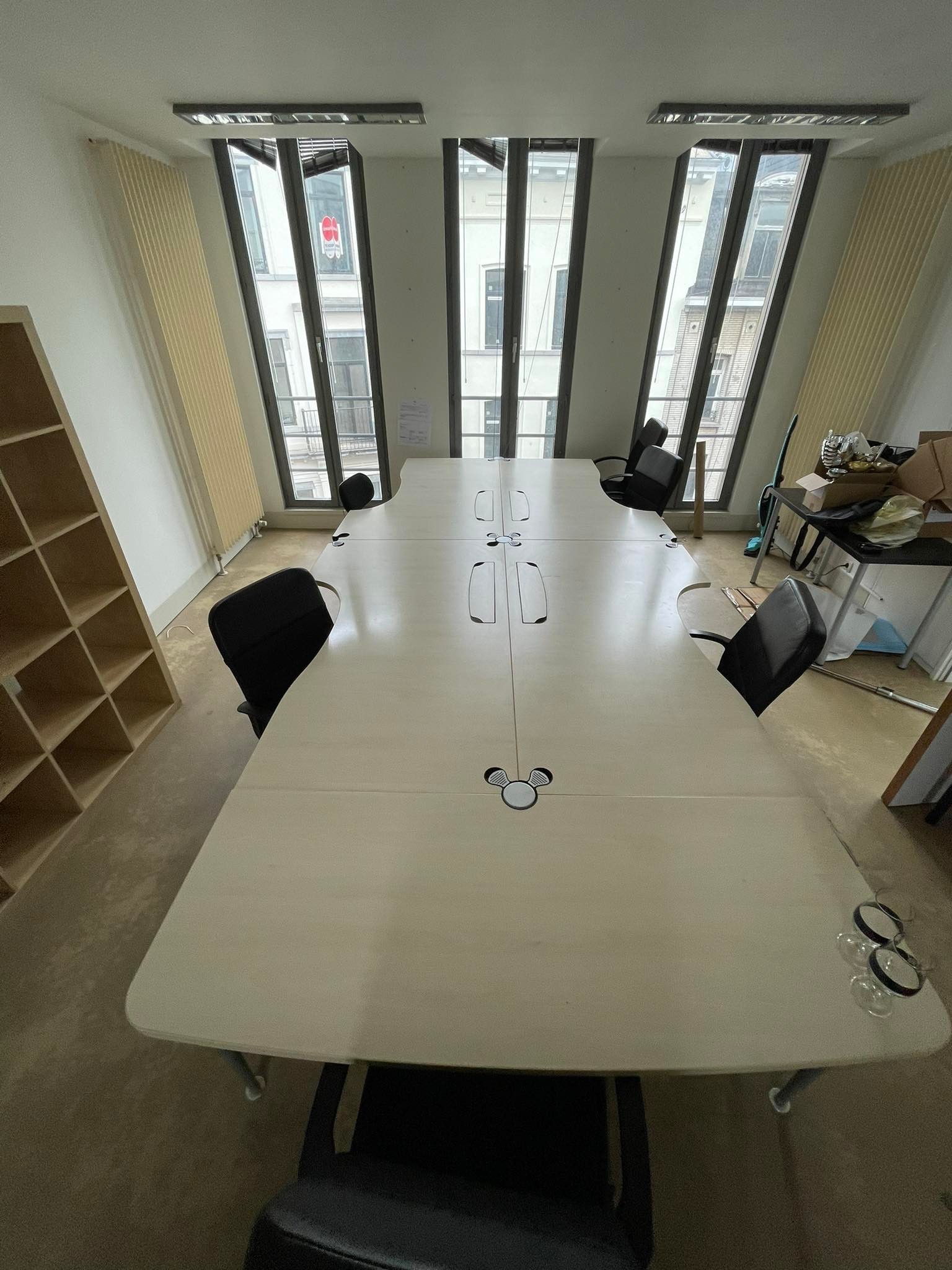 Bureau eilandje bestaande uit 5 ruime tafelbladen (kan nog met 2 extra tafelbladen verlengd worden, zie foto) De tafelbladen zijn zwaar en dienen in een grote camionette opgehaald te worden. Îlot de bureaux composé de 5 grands dessus de tables (peut être rallongé de 2 dessus de tables supplémentaires, voir photo). Les dessus de tables sont lourds et doivent être transportés dans une grande camionnette.