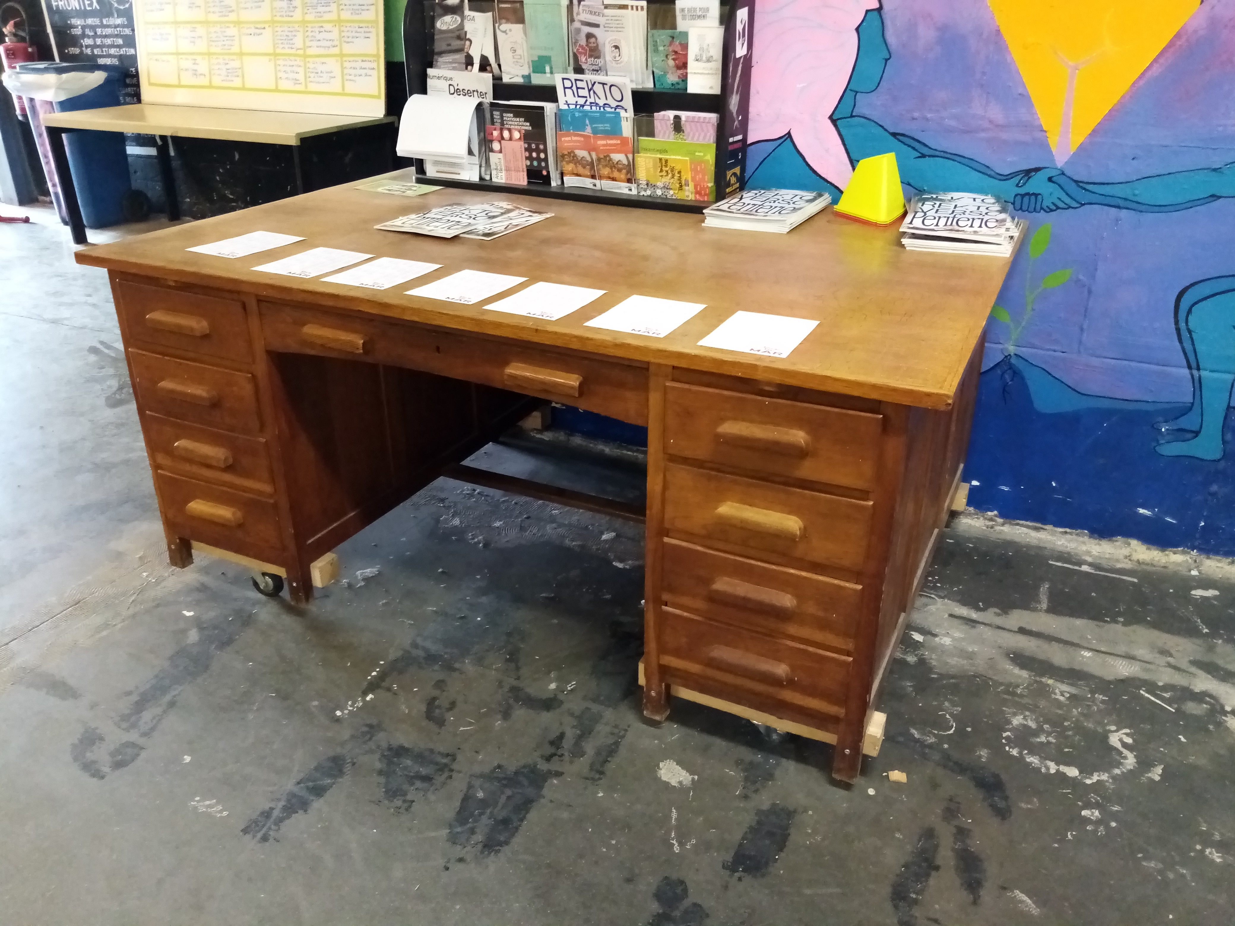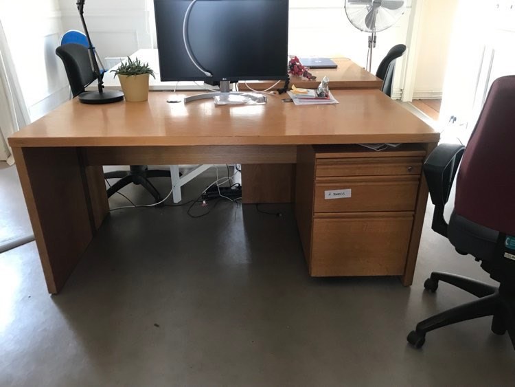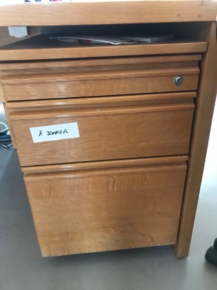 Two desks that originally come from the National Bank of Belgium. Very solide and heavy, beautiful massive wood. In good state. One of the two desks is L-shaped : extra 80 cm. ATTENTION: PICK UP ONLY 15 SEPTEMBER AS WE ARE RENTING A LIFT TO GET THE FURNITURE OUT !