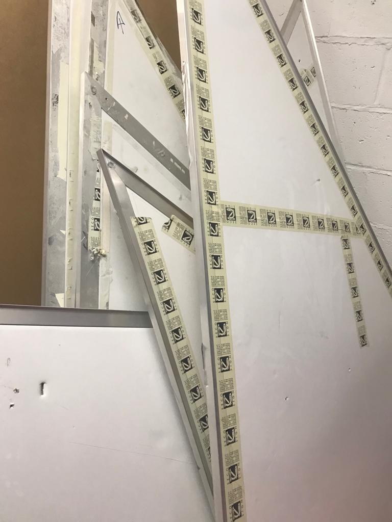 An art installation made out of 4 frames. The puzzle needs to be made, we don't have other plans than these. Une installation artistique composée de 4 cadres. Le puzzle doit être fabriqué, nous n'avons pas d'autres plans que ceux-ci. Een kunstinstallatie gemaakt van 4 frames. De puzzel moet nog gemaakt worden, we hebben geen andere plannen dan deze.