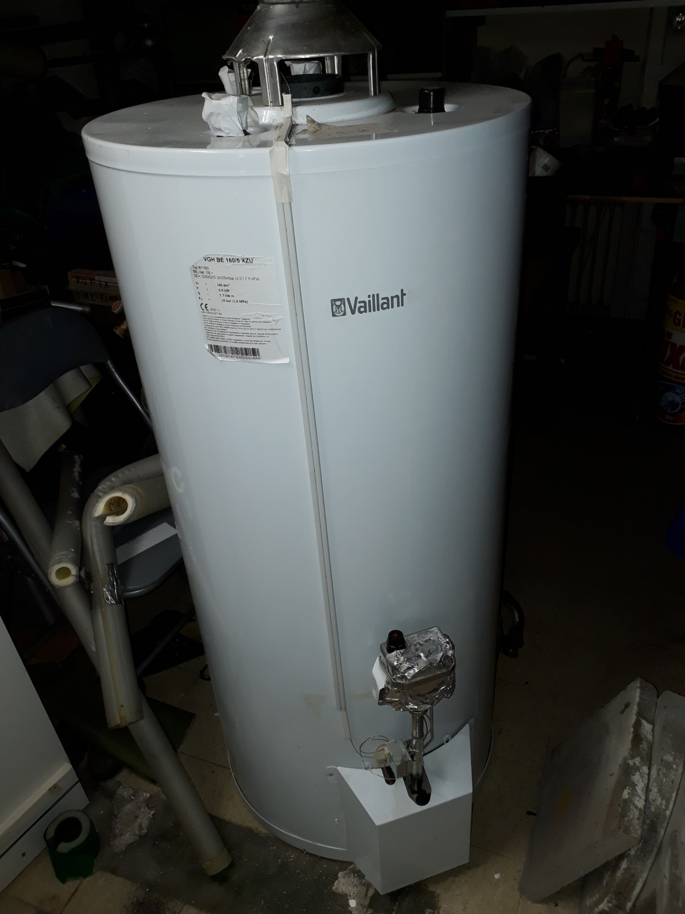 Chaudière gaz (uniquement pour chauffage, pas pour eau des sanitaires). Elle est vieille mais fonctionne encore bien. Elle est à venir démonter sur place à Molenbeek (rue Van Hoegaerde) avant le 10 juillet. J'ai vidé l'eau du circuit et le gaz est coupé.