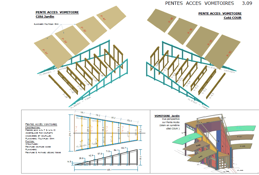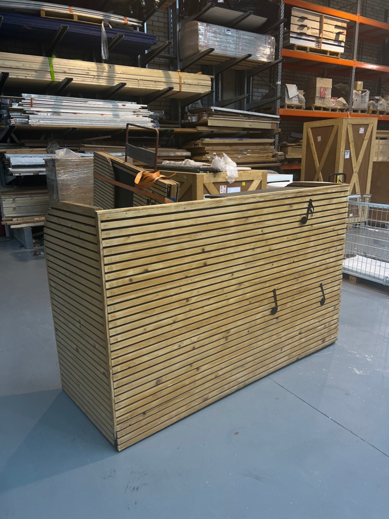 3 Bars pliables en bois (bois marin à l'arrière, lattes en bois de sapin à l'avant), pliable avec charnières et poignées pour rangement, il y a des planches horizontales en MDF qui sont manquantes (cfr photos)